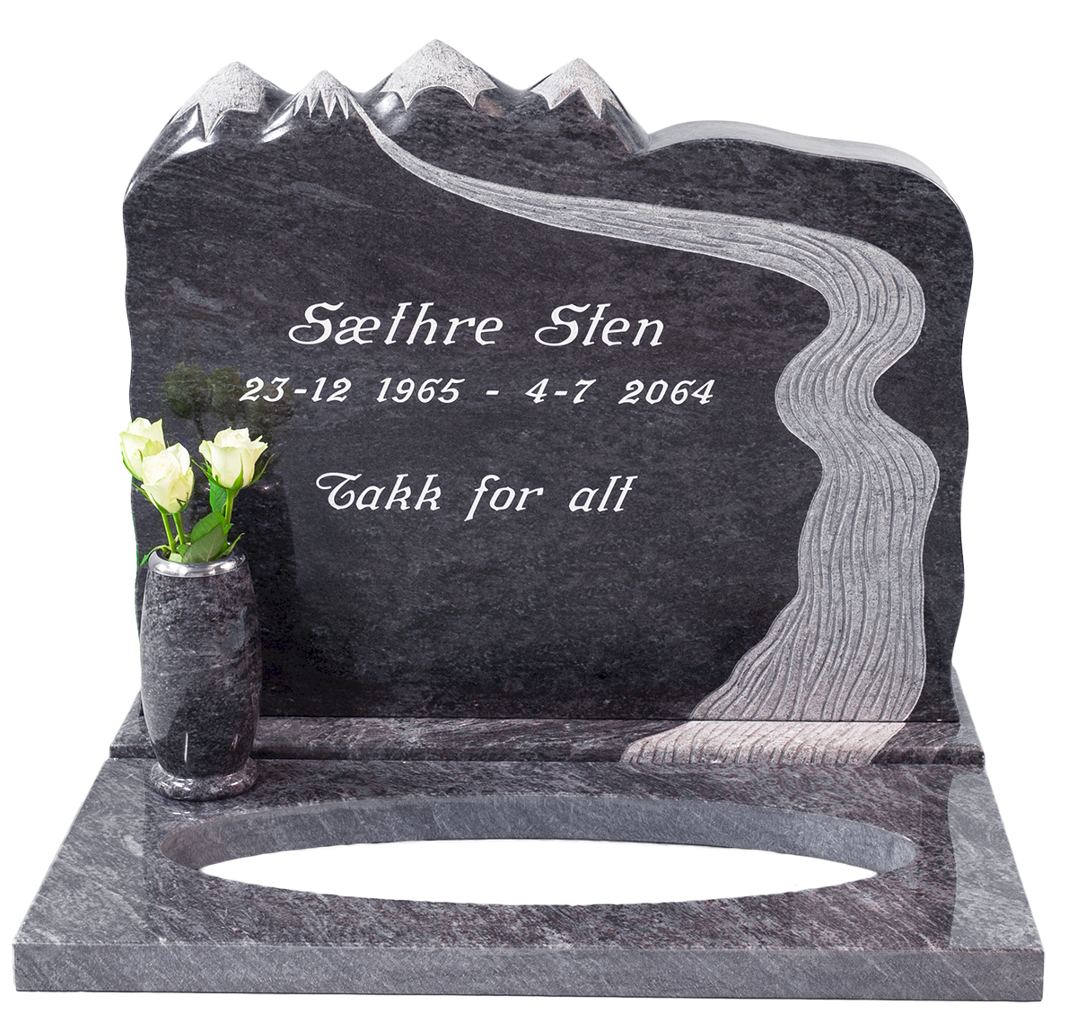 Unik egendesignet fjellstein. Hele steinen er polert, med finhugget fjell og elv. Leveres i 50, 70 og 80 cm bredde. Patentert stein