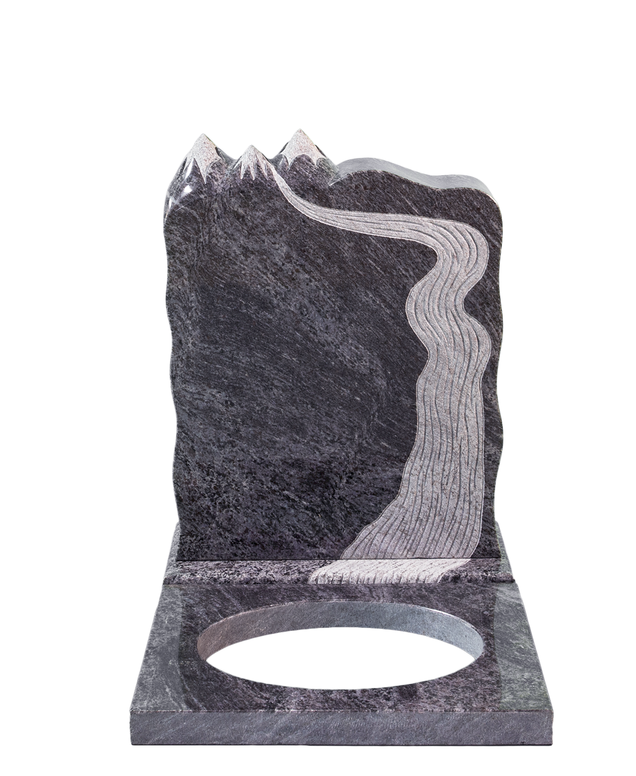 Unik egendesignet fjellstein. Hele steinen er polert, med finhugget fjell og elv. Leveres i 50, 70 og 80 cm bredde. Patentert stein
