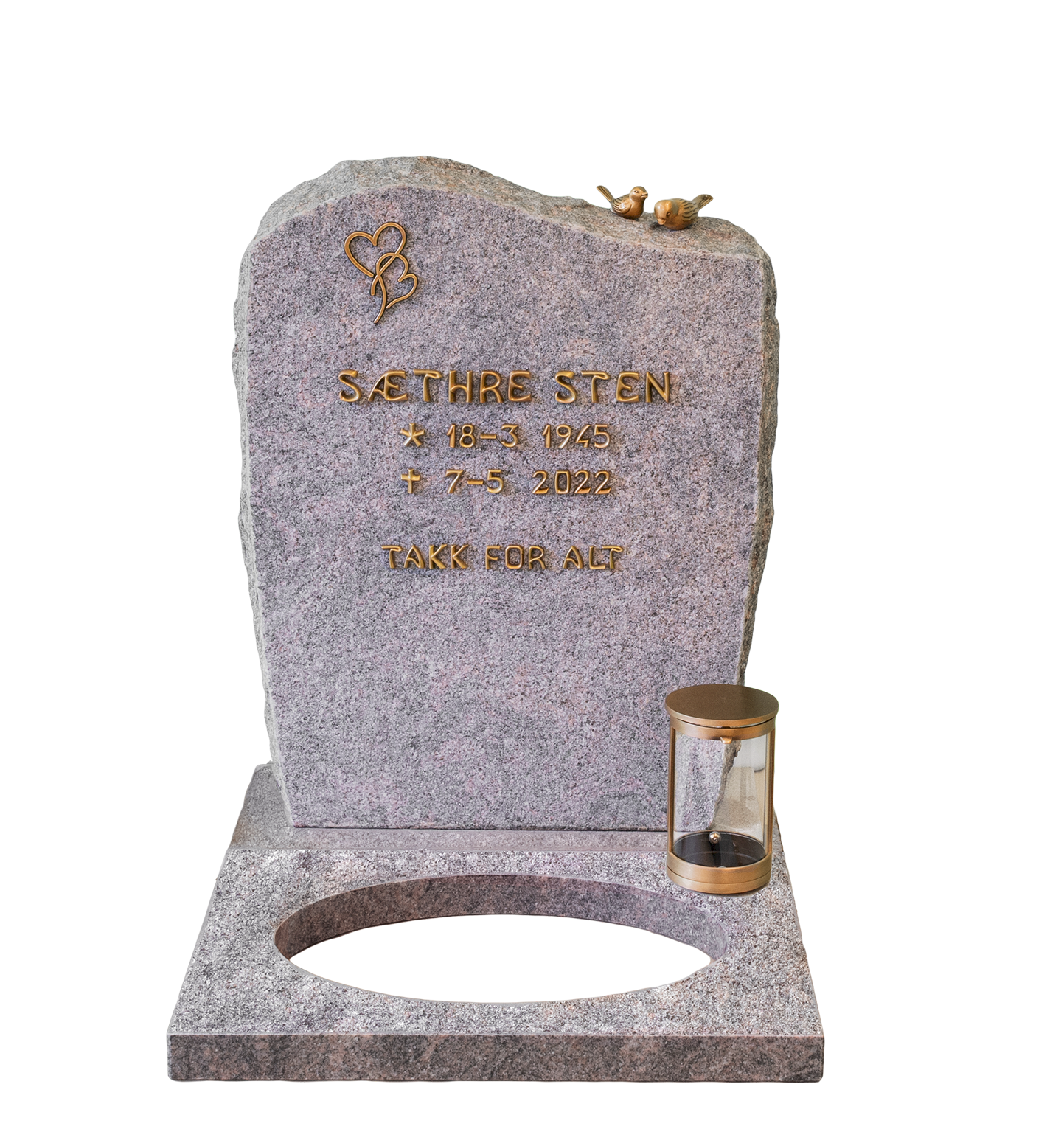 Vil du se utforming og pris? Svar på noen enkle spørsmål om skrift, dekor og beliggenhet, så guider vi deg gjennom valgene. Du velger å lagre designet, sende en forespørsel eller bestille direkte.